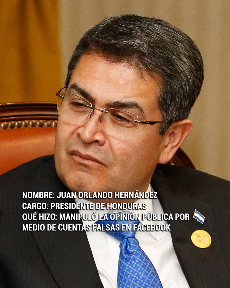 En 2019, Facebook anunció que había suspendido al menos 181 cuentas y cerrado más de mil páginas registradas en Honduras por no considerarlas auténticas y creadas para mostrar una imagen positiva de Juan Orlando Hernández.