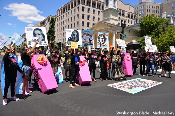 La directora de Casa Ruby, Ruby Corado, y otros manifestantes salieron de la Iglesia Cristiana de National City, en Thomas Circle, después de que los organizadores celebraran un «funeral» por tres mujeres trans -Roxsana Hernández, Victoria Arellano y Johana «Joa» Medina León- que murieron mientras estaban bajo la custodia del ICE o inmediatamente después de que la agencia las liberara.