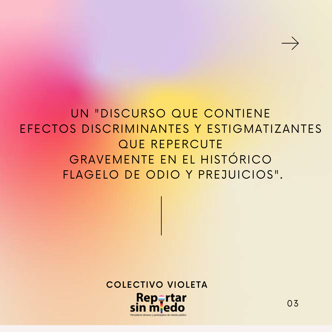 Por otra parte, el Colectivo Violeta denunció un “discurso que contiene efectos discriminantes y estigmatizantes que repercute gravemente en el histórico flagelo de odio y prejuicios en contra de personas no heterosexuales en nuestro país”.