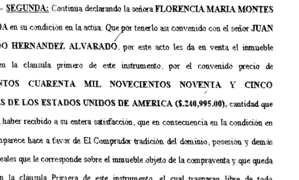 El expresidente le compró la millonaria casa a la licenciada en Educación Bilingüe Florencia María Montes Abastida por 240,995.00 dólares, equivalentes a 5,934,024.70 lempiras.