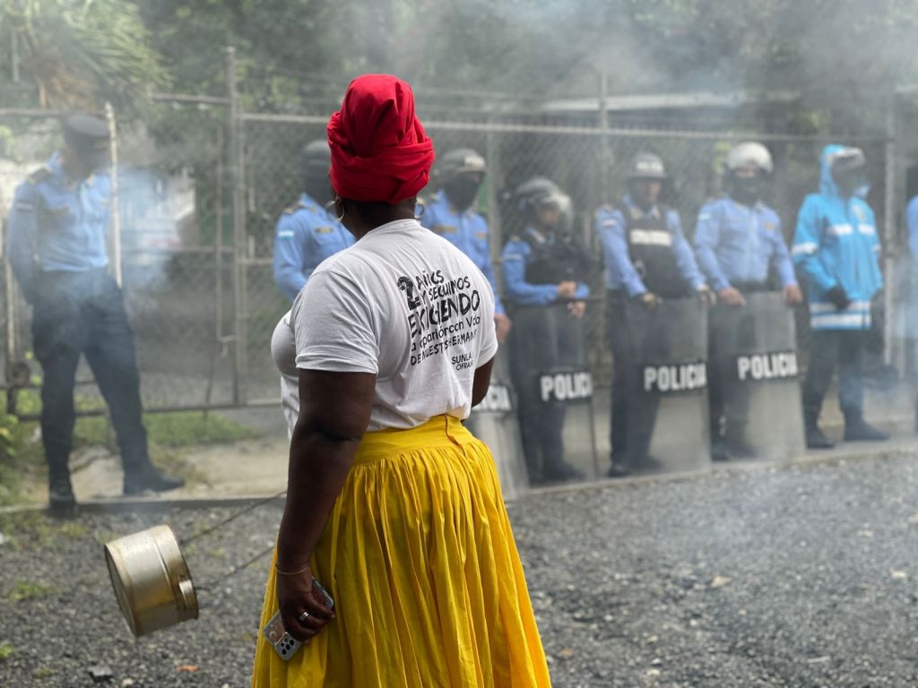 «Aquellas personas que no respeten la ancestralidad del pueblo garífuna van a perder. Y mucho», expresó Miranda ante las burlas y risas de policías que estaban afuera del juzgado.