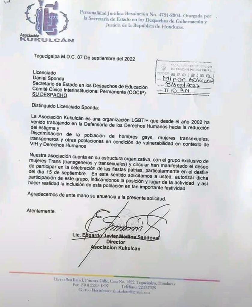 El 29 de agosto de 2022, la Asociación de Pastores de Tegucigalpa publicó un comunicado por «ataques a los principios y valores cívicos» y declaró que estaban en desacuerdo con que la comunidad LGBTIQ+ desfilara junto con la niñez y juventud en los actos de Independencia. Un acto de desinformación para desacreditar a la población diversa dado que no había hecho ninguna solicitud para participar.