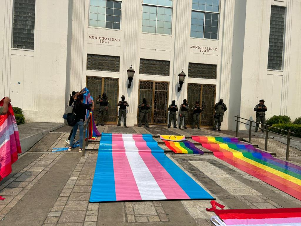 A continuación, los colectivos se instalaron hombro con hombro frente al edificio de la municipalidad, portando la bandera del arcoíris, la trans, la bisexual, la lésbica y la incluyente. Habían acudido al lugar con el objetivo de reclamar por lo que consideran un atentado cometido por el alcalde contra las poblaciones más violentadas del país.
