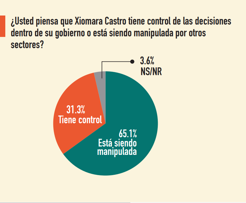 Según el sondeo, el 78% de las personas sondeadas opinan que Manuel Zelaya manipula a su esposa. Mientras tanto, apenas el 3.5% dijo que las élites son quienes manipulan a la mandataria.