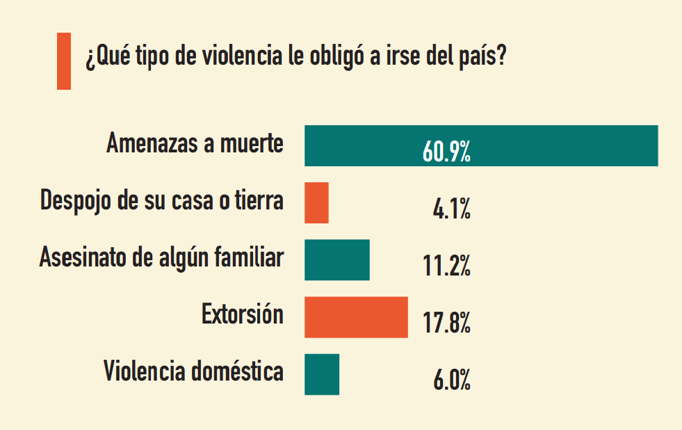 Por otro lado, casi la mitad de las personas entrevistadas, 46.9%, dicen que tienen familiares que han emigrado de Honduras durante el último año. ¿La principal razón? Las amenazas de muerte. Seis de cada diez personas, 60.9%, aseguran que sus parientes huyeron del país porque otras personas los amenazaron con matarlos.