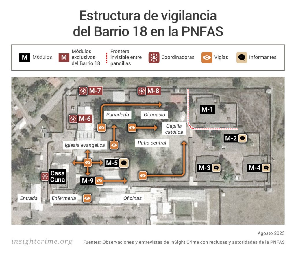 De esta manera, el Barrio 18 lleva varios años consolidando su dominio en la PNFAS, ocupando la mayor parte de los espacios y adquiriendo una mayor capacidad de influencia e intimidación frente a las autoridades para obtener beneficios e ingresar recursos.