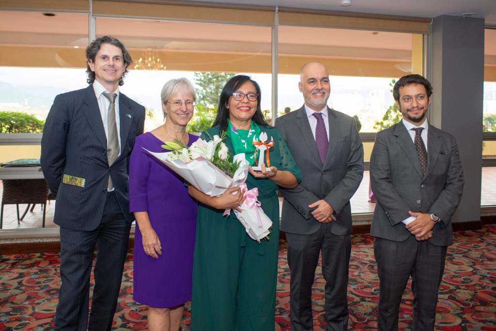 La embajadora del Reino de los Países Bajos para Centroamérica, Christine Pirenne, entregó en persona el premio a la ceibeña Norma Carías en una ceremonia en Tegucigalpa, Honduras.