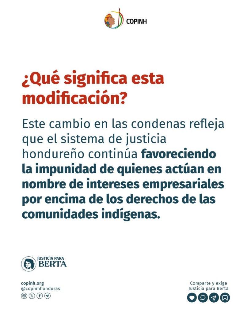 Pero la alegría duró poco, ya que unos cuantos días después, Bertha Zúniga Cáceres, hija de la ambientalista asesinada y coordinadora general del Copinh, aseguró que el anuncio de los medios sobre la condena de los asesinos “no se corresponde con lo que dice esta sentencia”.