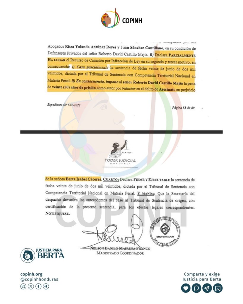 Asimismo, medios de comunicación y organizaciones en Honduras y en otros países afirmaron que las condenas de los responsables son “un momento de justicia”.