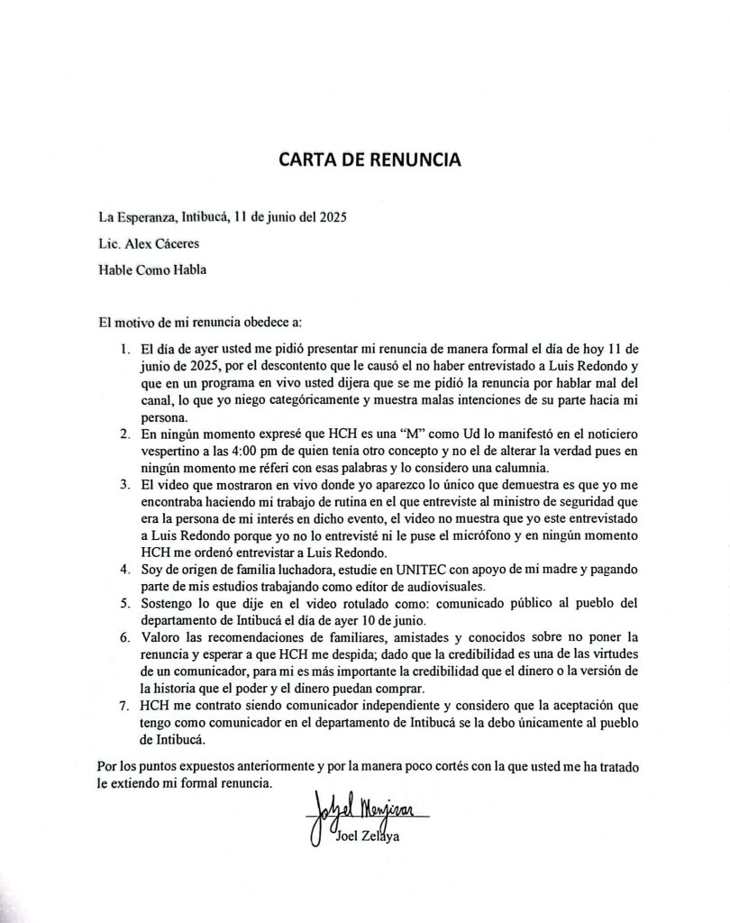 Según Zelaya, se le solicitó presentar su renuncia formal. El comunicador expresó que está de acuerdo con dejar el cargo y argumentó que el salario mensual de 10,000 lempiras no compensa las exigencias laborales del medio.