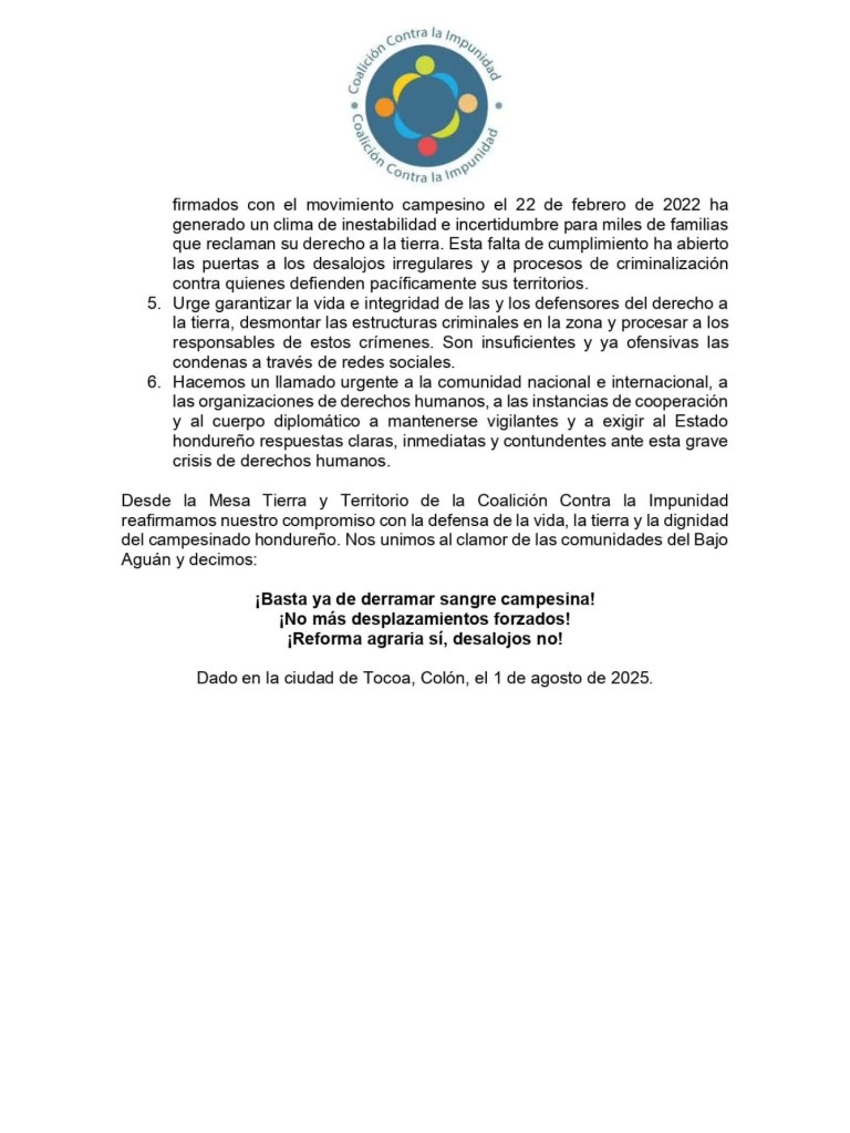 Las organizaciones firmantes denuncian que estos hechos no son aislados, sino parte de una estrategia de desarticulación del movimiento campesino, que incluye asesinatos selectivos, desplazamientos forzados y terror sistemático ejercido por estructuras criminales con presencia impune en la región, particularmente en la finca Paso Aguán. “Estos crímenes responden a una estrategia de desarticulación del movimiento campesino”, advierten en el pronunciamiento.