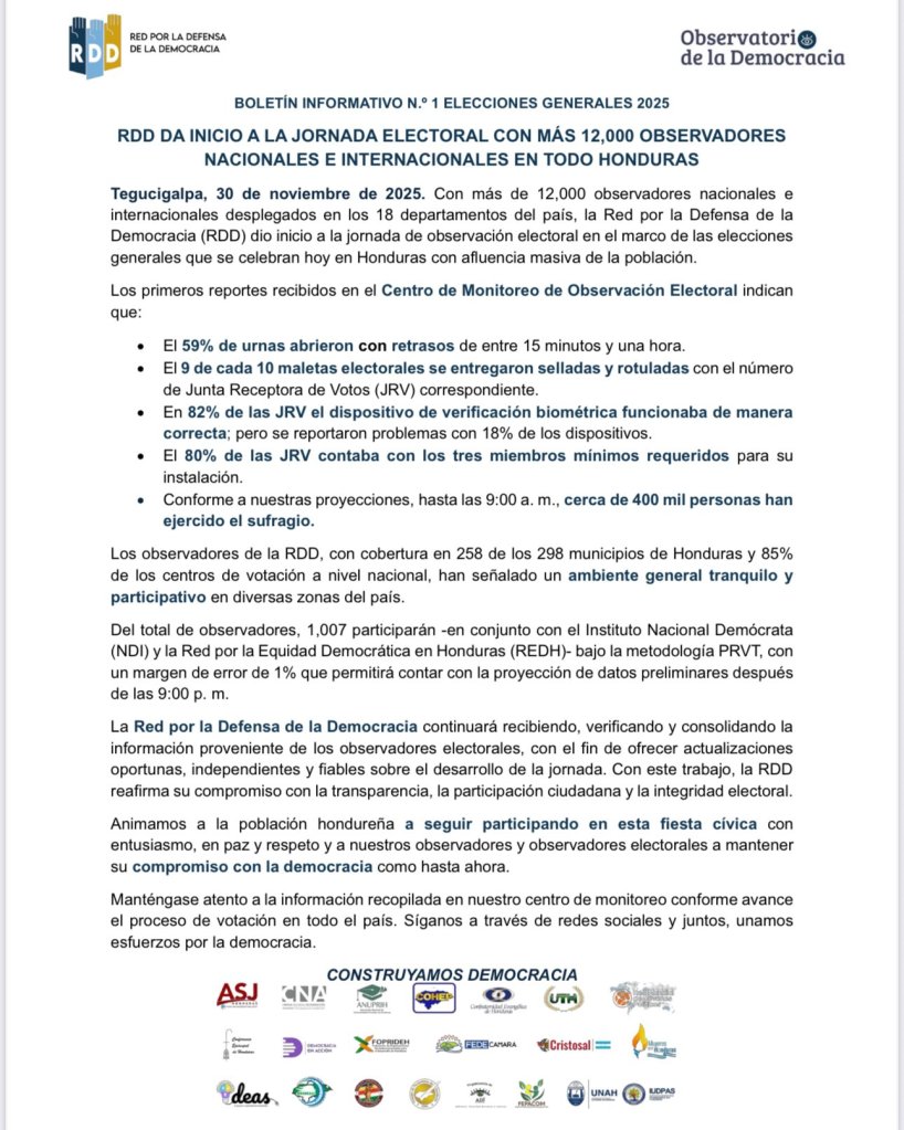 La Red por la Defensa de la Democracia (RDD) compartió su primer boletín informativo con un despliegue de más 12,000 observadores nacionales e internacionales en los 18 departamentos del país.
