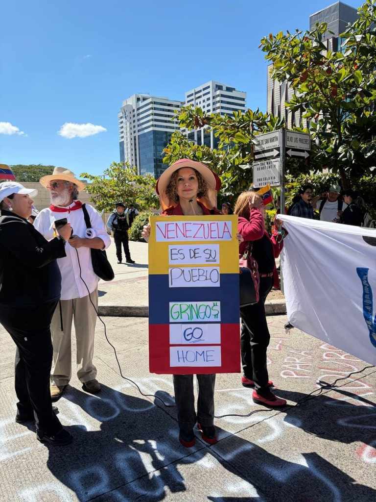 Este jueves, diversas organizaciones sociales se congregaron en protesta frente a la Embajada de Estados Unidos en Tegucigalpa para exigir el cese de la intervención estadounidense en Venezuela por parte del gobierno de Donald Trump. Entre las consignas coreadas por los manifestantes se escuchaban: «No a la invasión imperialista en Venezuela», «La soberanía y la autodeterminación de los pueblos se respetan. No a la injerencia extranjera» y un contundente «No a la invasión», «Fuera a las bases gringas». En las imágenes de la protesta se observa a la secretaria de Derechos Humanos, Natalie Roque, portando un rótulo con el mensaje: «Venezuela es de su pueblo, gringos go home».